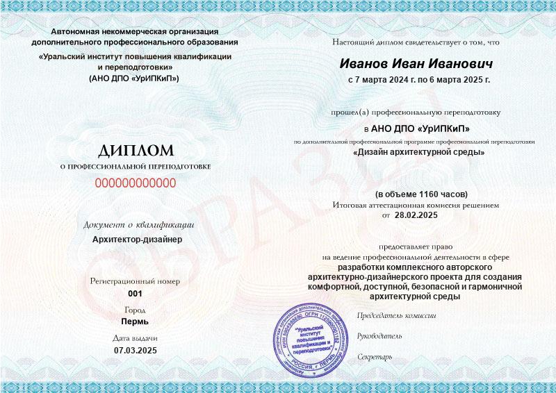 • Диплом о профессиональной переподготовке АНО ДПО «НАРХСИ» с присвоением квалификации «Архитектор-дизайнер».