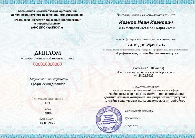 Да, дипломы и удостоверения оформляются в соответствии с действующим законодательством РФ. Документы печатаются на специальных бланках, заверяются печатью АНО ДПО «УрИПКиП».