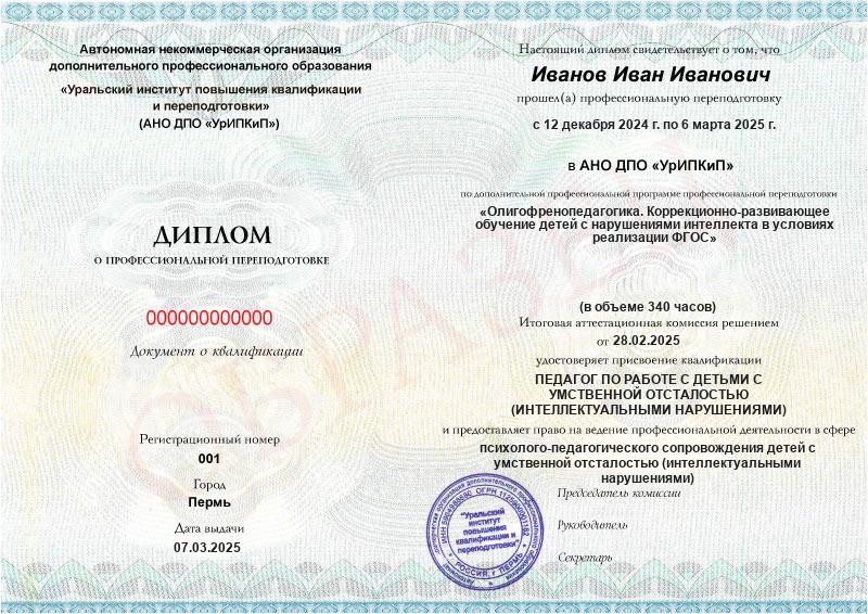 • Квалификация: Педагог по работе с детьми с умственной отсталостью (интеллектуальными нарушениями)