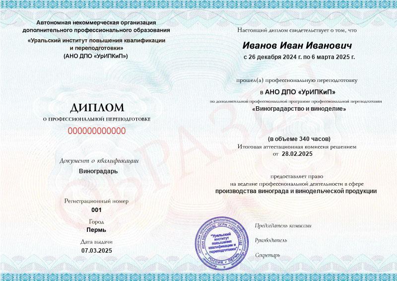 • Диплом АНО ДПО «МАСХ» с присвоением квалификации «Виноградарь» и доп. квалификации «Технолог-винодел» в сфере производства винограда и винодельческой продукции.